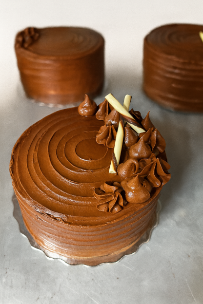 A rich and indulgent chocolate cake with moist layers of dense chocolate sponge, filled and topped with creamy chocolate fudge.