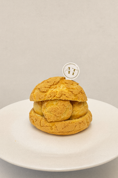 A larger version of our signature cream puff — made with layers of light choux pastry filled with smooth vanilla custard cream and fresh whipped cream
