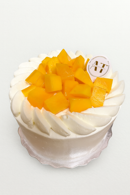 A light and fluffy sponge cake layered with smooth cream and fresh mango slices.