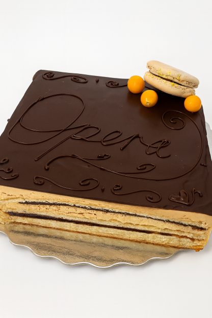 A classic French layered dessert featuring almond sponge soaked in coffee syrup, layered with rich coffee buttercream and smooth chocolate ganache.