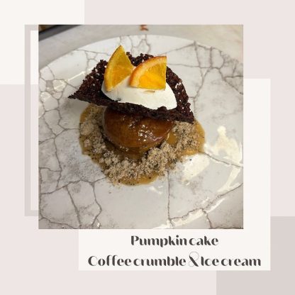 Savor the flavors of autumn with our indulgent Pumpkin Cake Coffee Crumble & Ice Cream. This dessert features a moist, spiced pumpkin cake layered with a rich coffee-infused crumble. Served alongside a scoop of creamy vanilla ice cream, it’s a harmonious blend of warm and cool, spicy and sweet. The pumpkin’s earthy notes perfectly complement the coffee’s robust flavor, while the ice cream adds a luxurious finish. It’s an irresistible treat that captures the essence of fall in every spoonful.